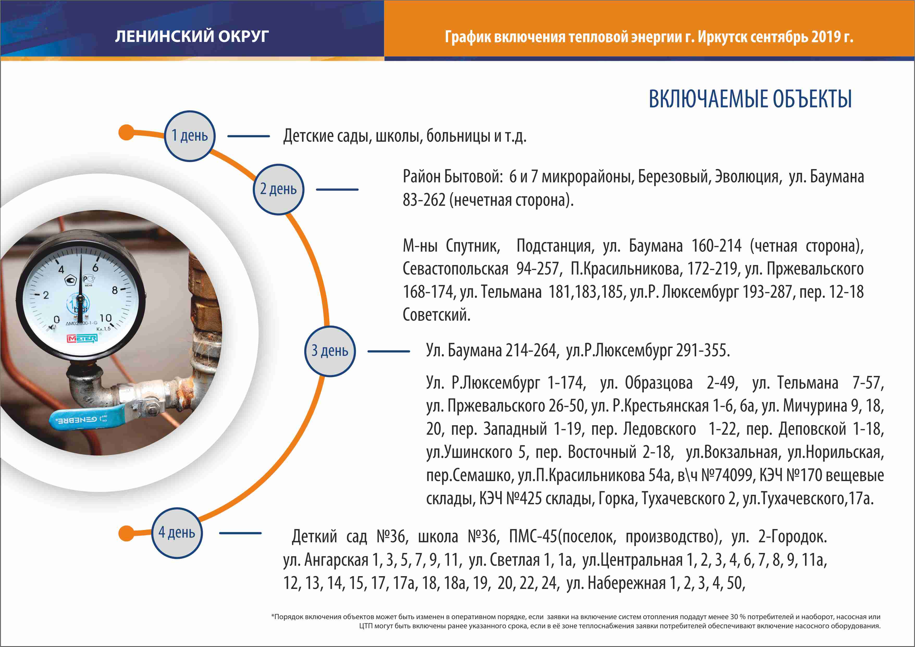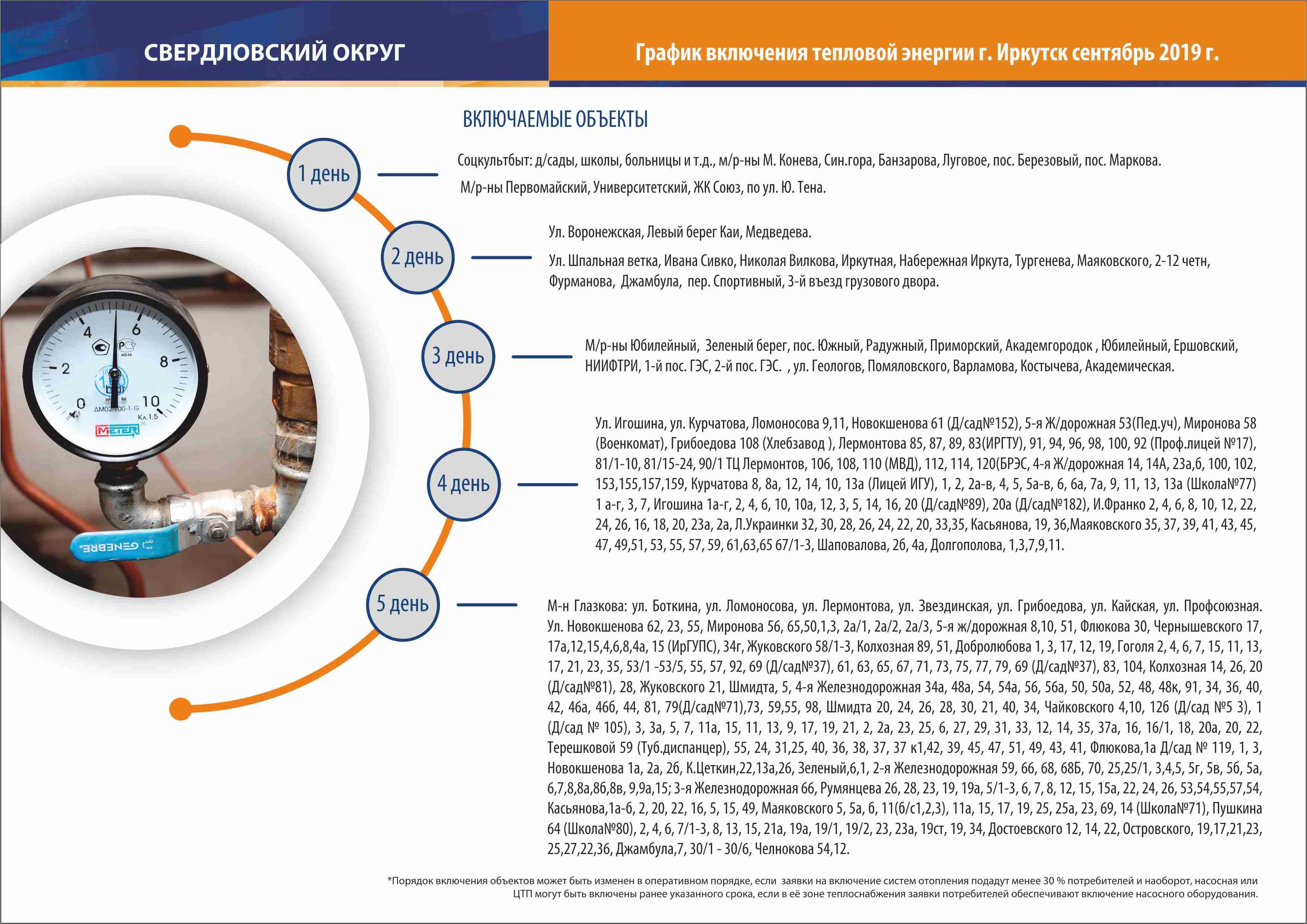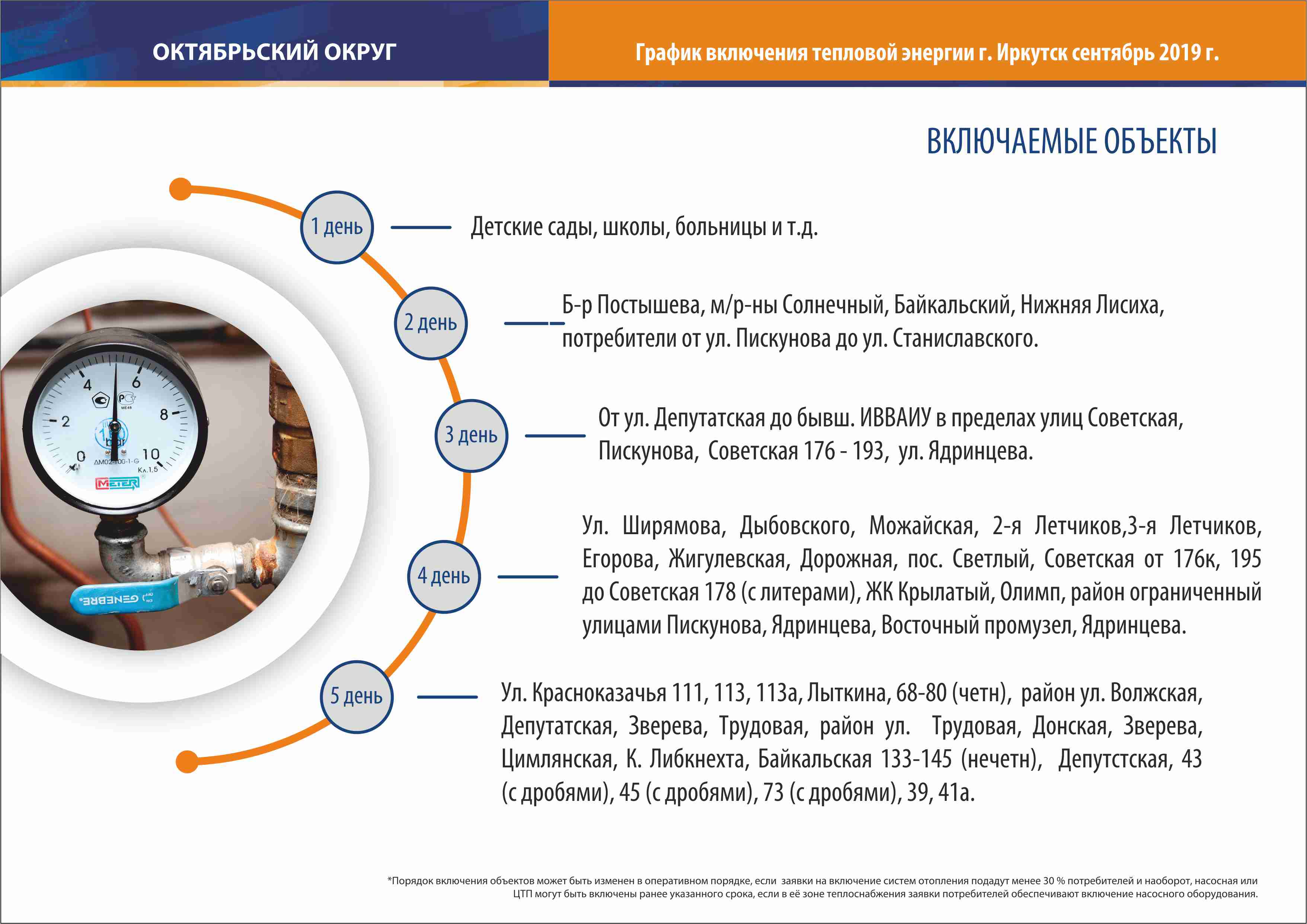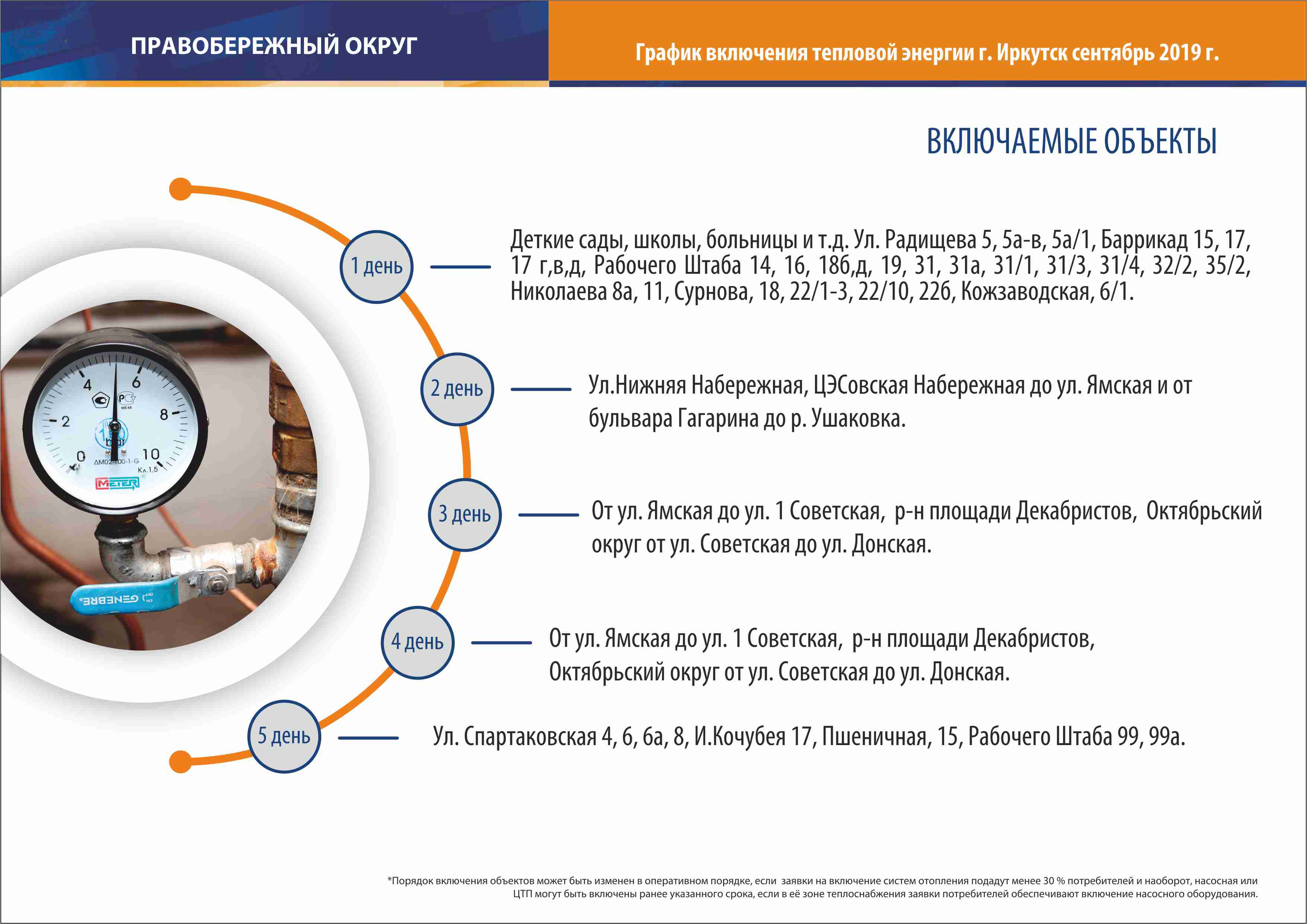 16 сентября в Иркутске начался отопительный сезон. В инфографике представлена последовательность подключения объектов города к теплоснабжению по районам, первый день – это 16 сентября. Если в соответствии со схемой к вашему дому тепло подведено, а батареи холодные, значит сами собственники отложили начало отопительного сезона. Управляющая компания подключает дом к теплу на основании решения жильцов.